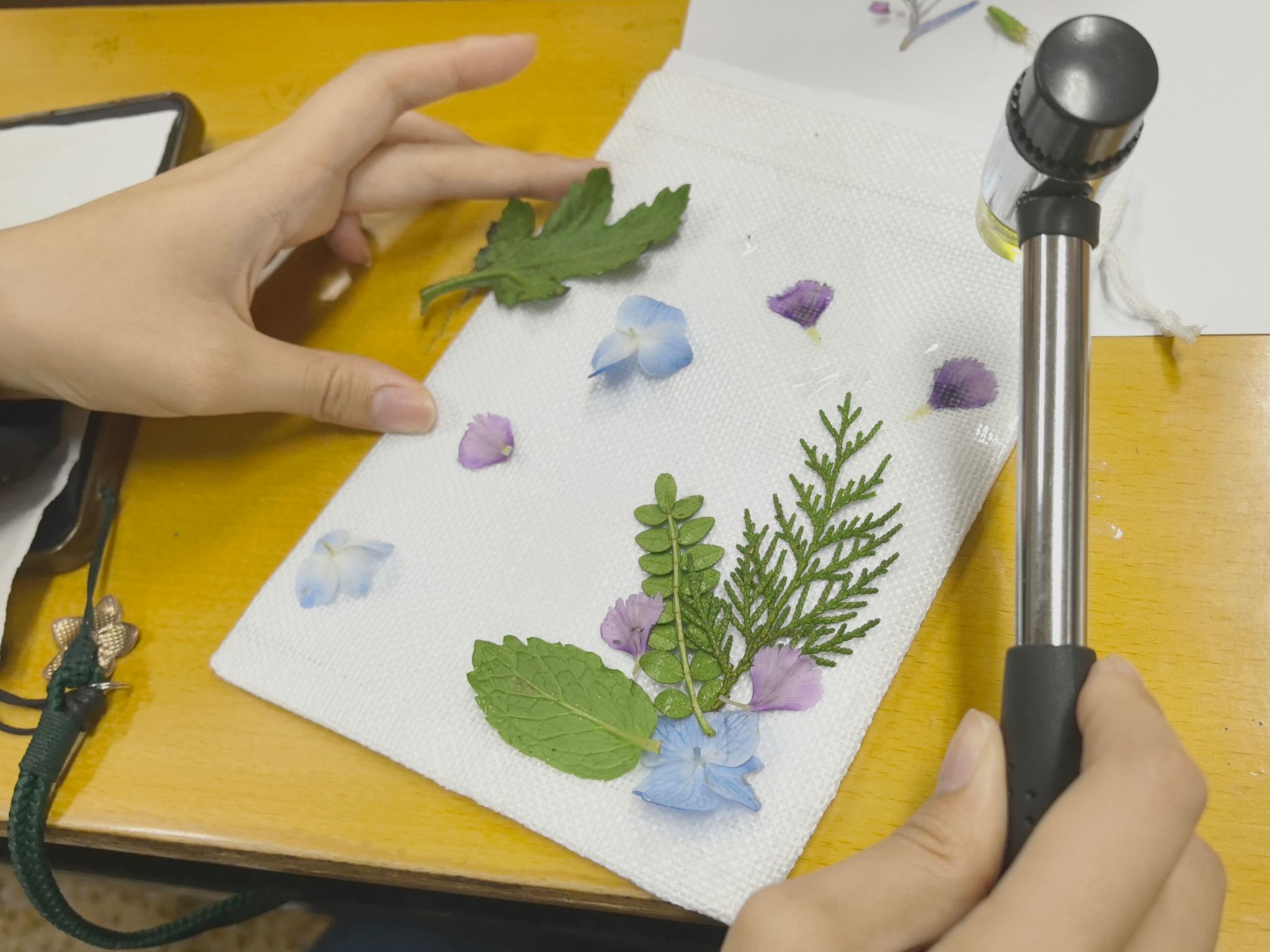 领取拓印工具包,带着新鲜的草木叶片。志愿者们化身创意匠人,在帆布袋、书签上自由创作。锤声轻响,草木的脉络与纹理缓缓晕染在布面之上,自然的肌理、春日的色彩,被定格成独一无二的手作浪漫。