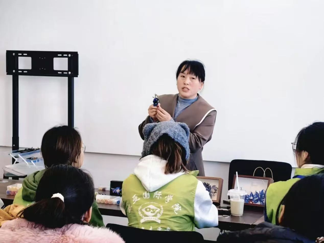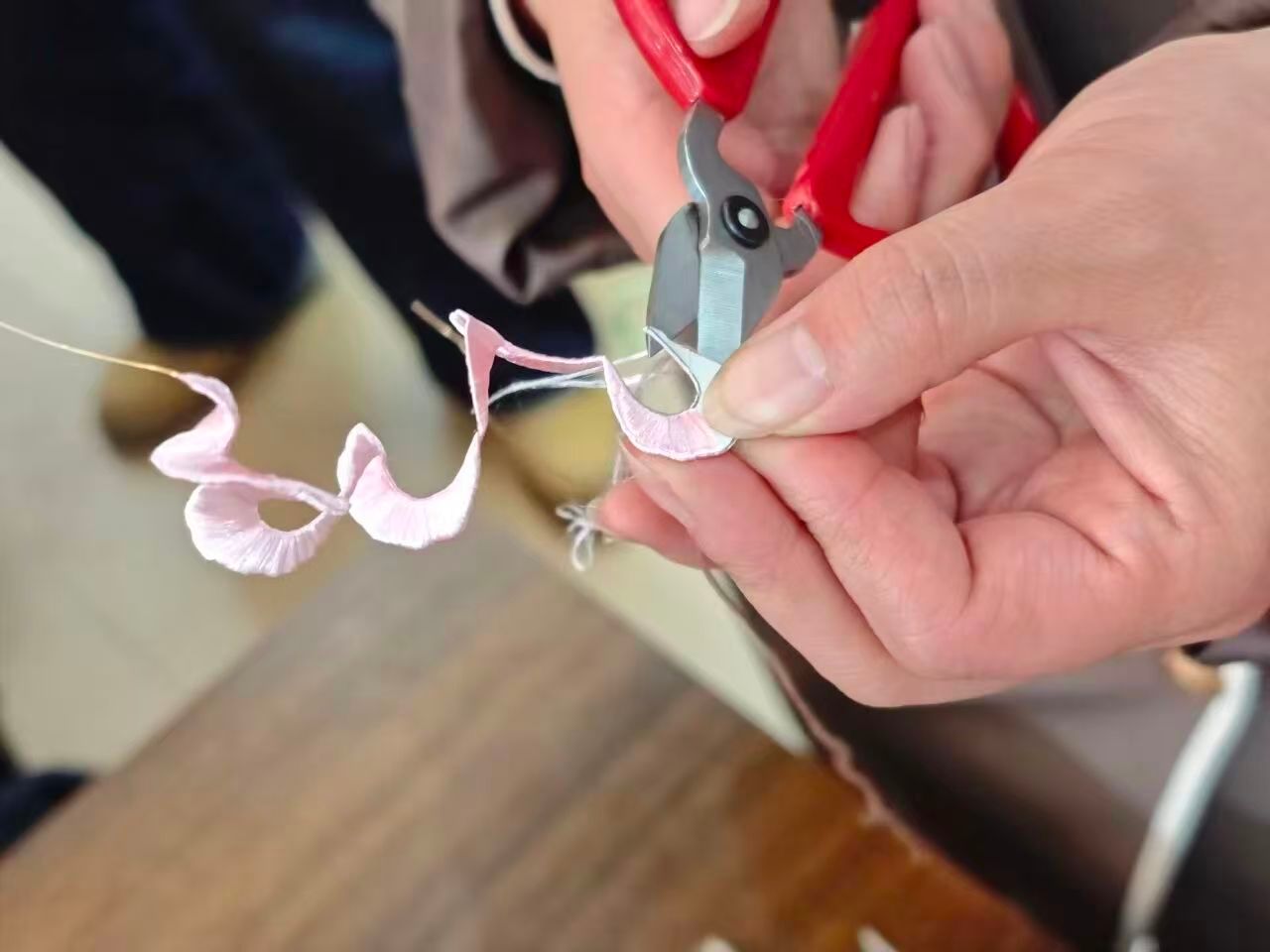 下午时分,志愿者们便早早抵达现场,活动序幕伴随着丝线缓缓铺展。老师手持铜丝与丝线,一步步演示如何将细软的丝线紧密缠绕在骨架上,如何通过叠绕、扭绕塑造出花瓣的弧度。志愿者们则在老师的指导下,认真练习每一个绕丝手法,耐心调整力度与角度。