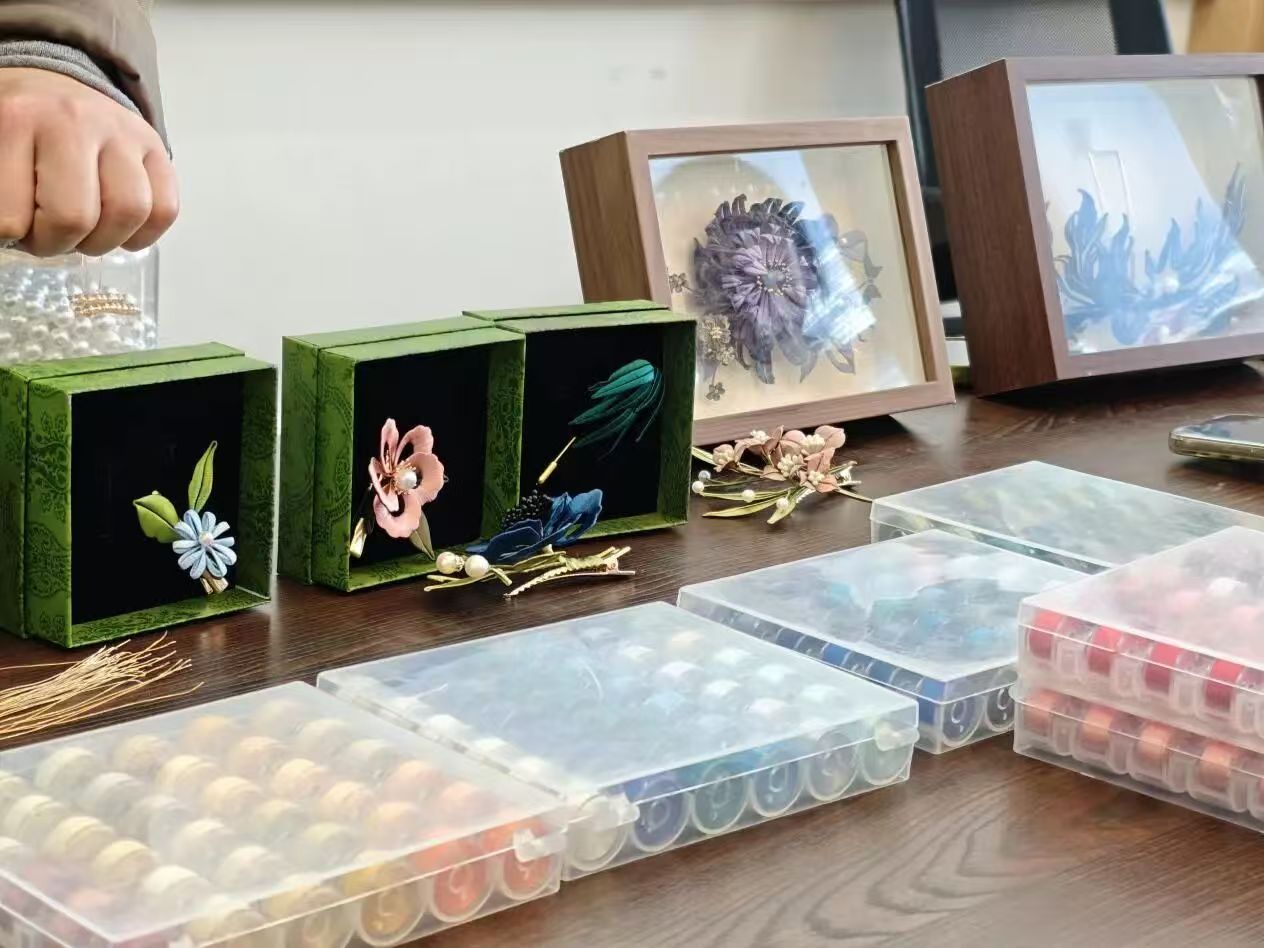 指尖的丝线渐渐成型,活动也接近尾声。大家将完成的缠花作品别在发簪、胸针上,带着满心欢喜与亲手造物的成就感,用相机记录下捧着作品的雀跃瞬间。回望这场指尖之约,让各位志愿者们沉浸于丝线缠绕的细腻触感,在一针一线中感受传统手艺的温度,解锁非遗传承与美育熏陶的双重体验。