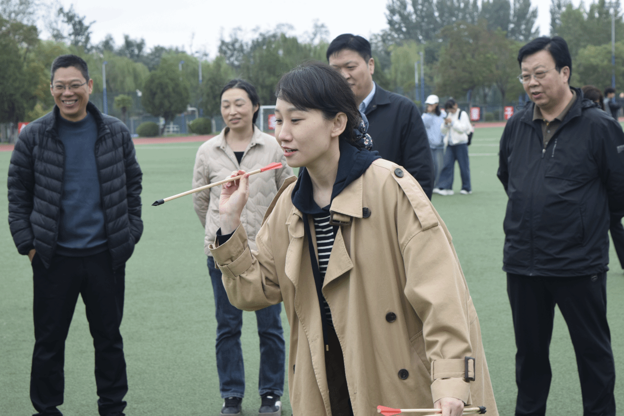 教师们也积极投身赛场,为运动会增添了更多欢乐与温情。投壶比赛中,老师们瞄准壶口投箭,每一次命中都引来学生阵阵喝彩;乒乓球绕桩时,有人稳稳端球顺利往返,也有人偶尔掉球笑着重来;套圈与丢沙包项目里,老师们重拾童年乐趣,与学生们的欢呼声交织在一起,师生间的距离在互动中悄然拉近。