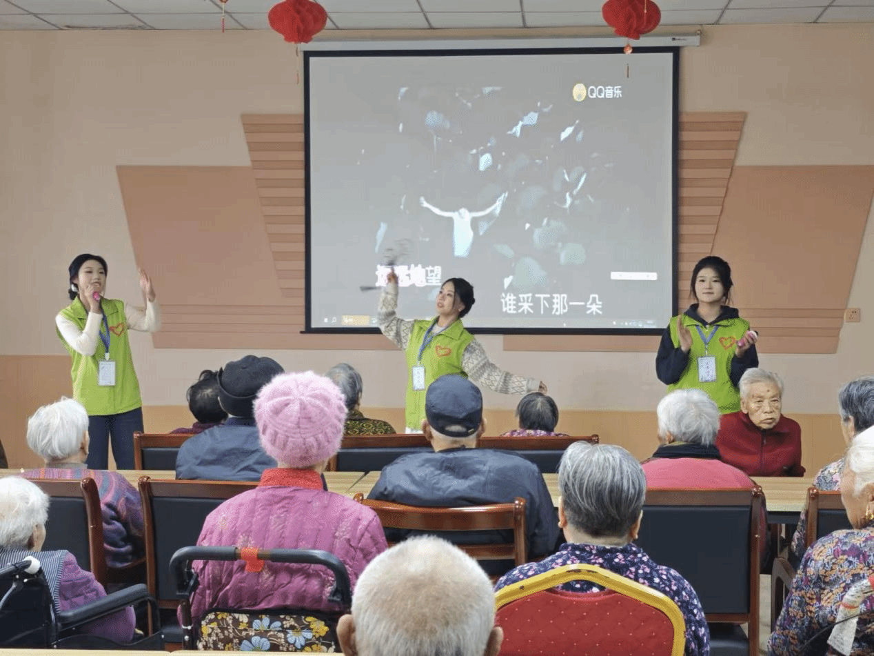活动当天,志愿者们早早抵达现场,精心布置活动空间,摆放座椅、整理物料,营造出温馨有序的氛围。待老人们安稳就座,文艺表演正式拉开帷幕。25级播音主持与艺术专业的宋赢、曲佳音以一曲《荷塘月色》深情开唱,伴以25级学前教育专业徐靖怡的翩然舞姿,歌声与舞蹈相得益彰,共同勾勒出一幅静谧美好的画卷。随后,志愿者们齐声合唱《没有共产党就没有新中国》,熟悉的旋律唤起共鸣,不少老人也轻声跟唱,现场气氛庄重而感人。